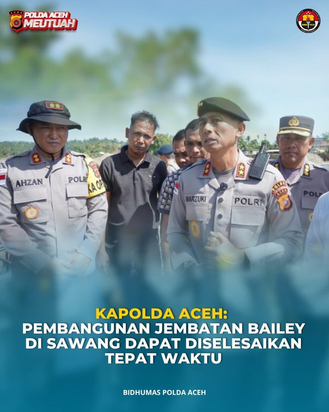 ACEH UTARA – Kapolda Aceh, Irjen Pol. Drs. Marzuki Ali Basyah, M.M., menegaskan bahwa pembangunan Jembatan Bailey di Kecamatan Sawang, Kabupaten Aceh Utara, dapat diselesaikan tepat waktu sehingga akses masyarakat yang sempat terputus akibat banjir bandang segera kembali normal.
