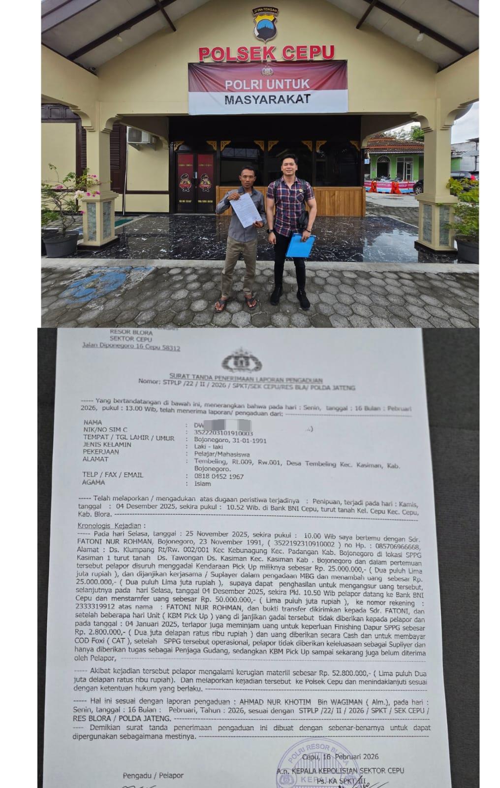 Kasus ini Bermula tanggal 04 Desember 2025 (DAN) Mentrasfer sejumlah Uang senilai 50 juta rupiah di bank BNI cabang CEPU kota Blora Ke nomor rekening 2333319912 atas nama Fatoni nur rachman, alih alih uang 25 juta yang di gunakan untuk menggadai mobil pickup Milik Fatoni nur Rachman akan tetapi sampai saat ini Mobil tersebut tidak di berikan oleh Fatoni Nur rachman kepada (DAN) Sedangkan 25 juta lagi untuk deposit menjadi suplayer bahan pangan, akan tetapi DAN tidak menjadi Suplayer tetapi Pekerja di SPPG kasiman 1 dan Kerugian Yang di alami 50 juta rupiah.