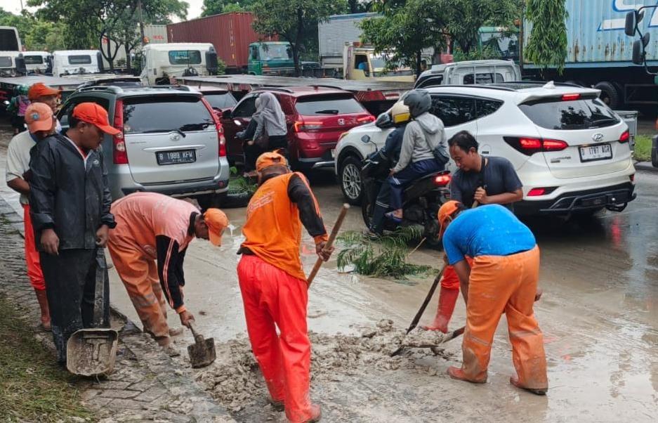 Dengan kondisi jalan seperti itu, pihak kelurahan Cilincing langsung turun ke lokasi dan melakukan pembersihan jalan dari lumpur dan sampah yang tentunya sangat mengganggu masyarakat pengguna jalan.