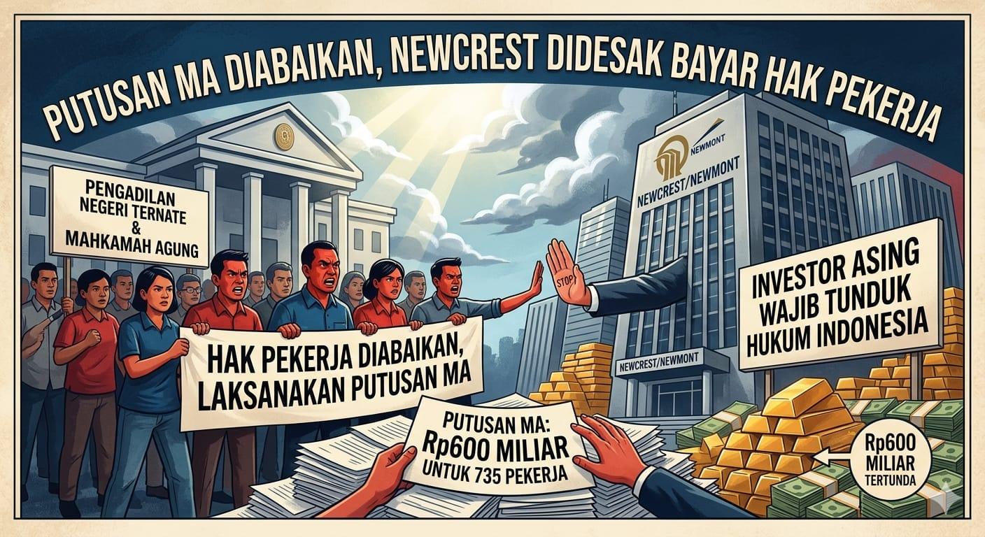 Radar Nusantara, JAKARTA – Desakan keras dialamatkan kepada Newcrest Mining Limited, yang kini menjadi bagian dari Newmont Corporation, untuk segera melaksanakan putusan pengadilan terkait pembayaran pesangon kepada 735 mantan karyawan PT Nusa Halmahera Minerals (NHM). Hingga saat ini, kewajiban tersebut dinilai belum dijalankan meski telah berkekuatan hukum tetap.